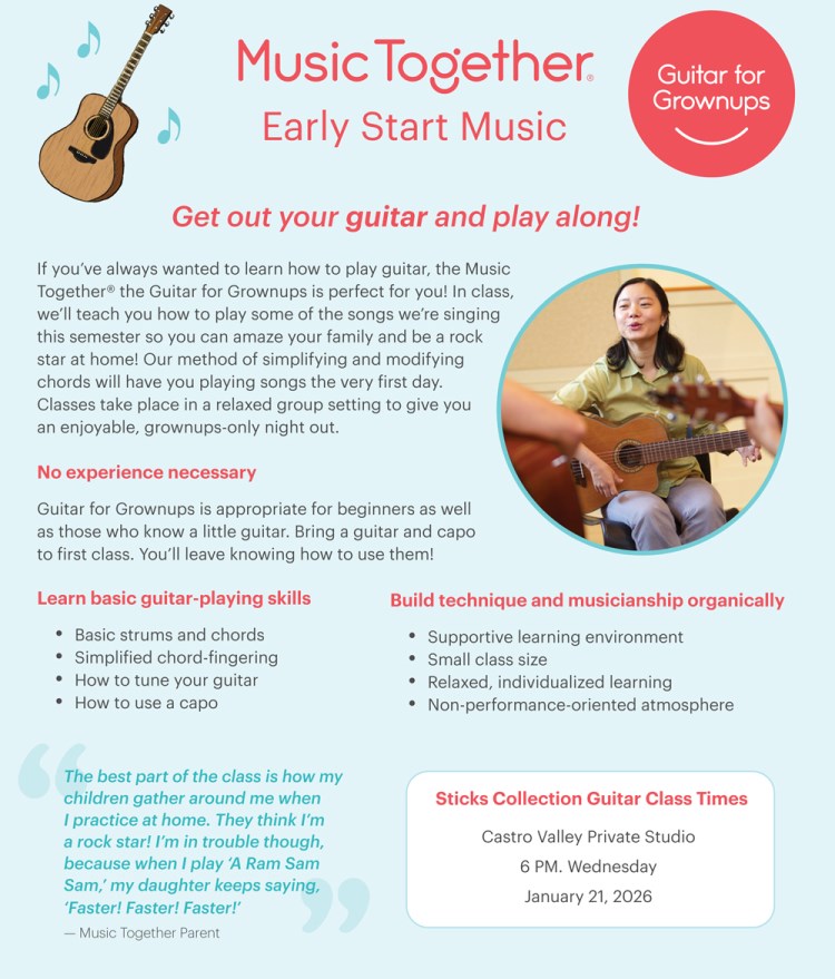 I am so excited to be teaching Guitar For Grownups. The Music Together® Collection has been such an inspiration to me and the children. Being able to play those songs on the piano and guitar has inspired my 5-year-old to play instruments as well. It has brought us closer together, even with my 15-month-old being able to play and sing at home. And has brought us closer together playing at home. I know it is the same for all families. Children want to be present with their caretakers, and what better way than to learn by playing the music they love!